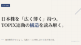 1475が追うTOPIX(配当込み)は、JPX総研が算出する指数(指数ルールで作った成績表)で、日本の株式市場を広範に網羅するベンチマークである。今のTOPIXはプライム・スタンダード・グロース市場の内国普通株式を母集団とし、浮動株をベースにした時価総額加重(会社の規模が大きいほど多く持つ仕組み)で計算される。さらに、一部の巨大銘柄にはウエイト上限10%の調整も入る。