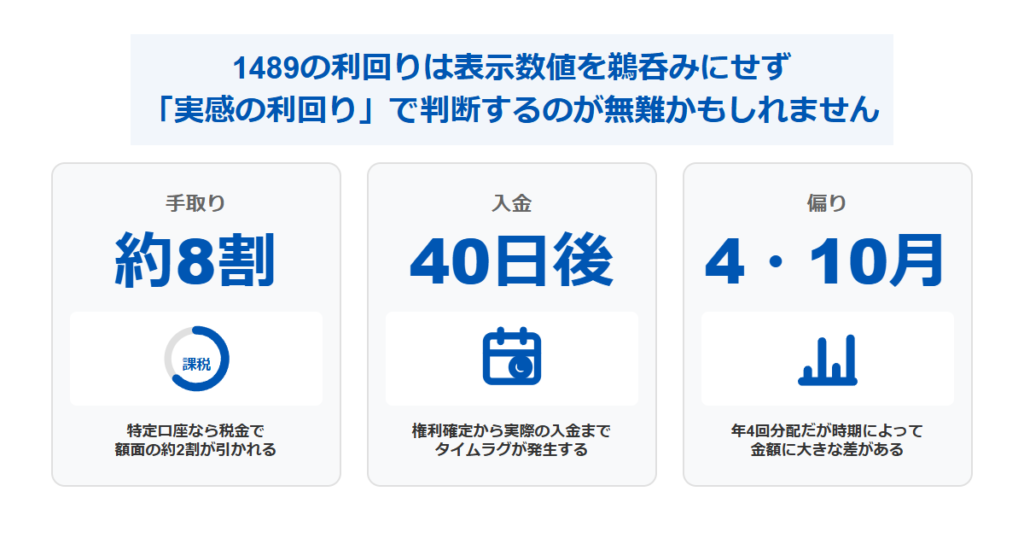 結論:1489の利回りは「表示されてる%」を鵜呑みにするとズレる。分配は年4回(1/4/7/10)で入金まで約40日、税引後手取り(課税×0.79685)やTTM(過去12か月でもらった分配金合計)/年換算の違いまで見て初めて実感の利回りになる。