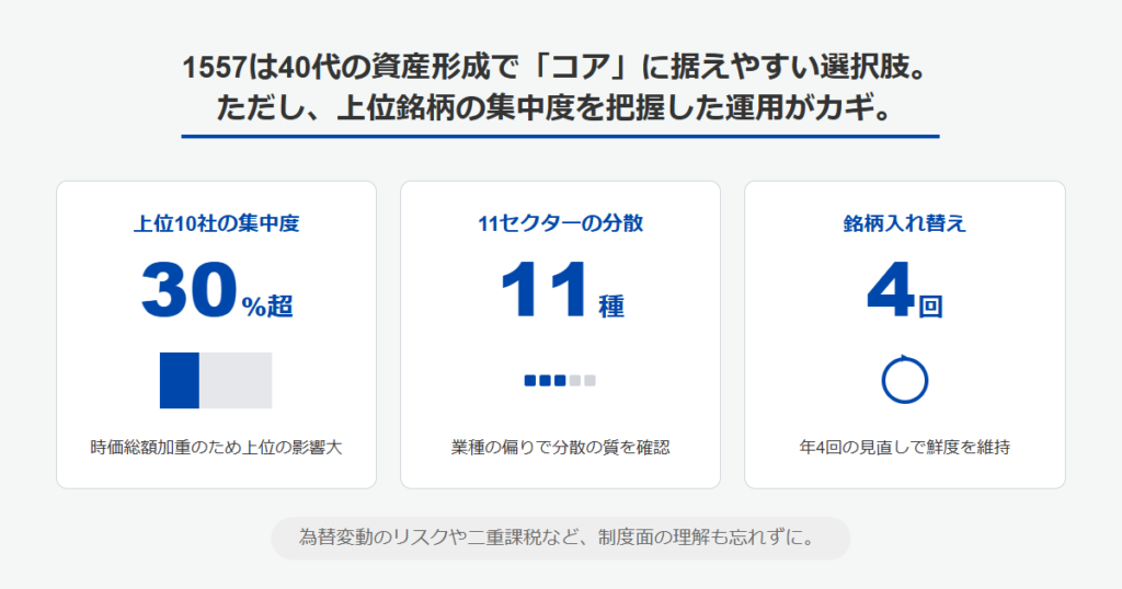 1557は一本で分散しやすく、40代の資産形成でコアに置きやすいETF。ここは素直に強み。