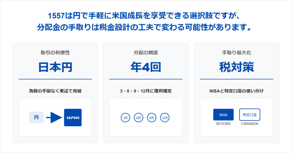 1557は、円で買えるS&P500連動商品で、分配金を受け取りたい人に向いた選択肢。