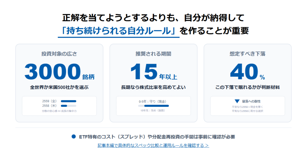 新NISAを始める40代が、全世界(2559)とS&P500連動(2558)で迷うのは自然。