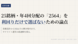 2564を持ち続けてよいかは、価格ではなく前提で判断するべきだ。高配当25銘柄に絞る設計、四半期分配、コスト、流動性、そして自分のポートフォリオ内での役割が生きているなら継続でよい。崩れたときだけ、代替候補との比較に進めばいい。違いを整理したいなら、次は比較(VS)記事か概要記事で全体像を確認したい。