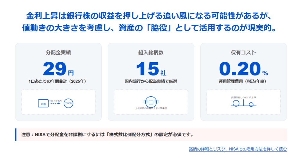 315Aは、銀行株の中でも配当実績が高い銘柄に寄せたETFで、金利上昇局面の追い風を取りに行く設計。