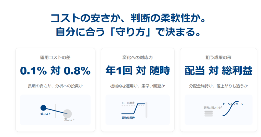 運用の仕組みや配当の安定感、コスト、リスクの取り方まで、骨格から別モノだ。