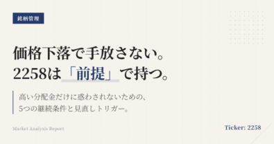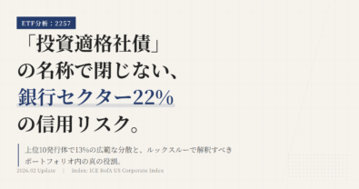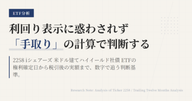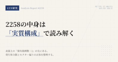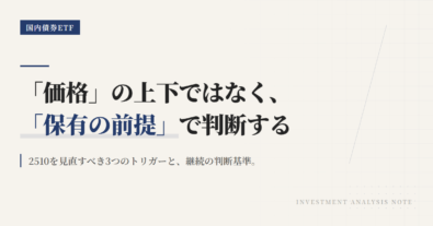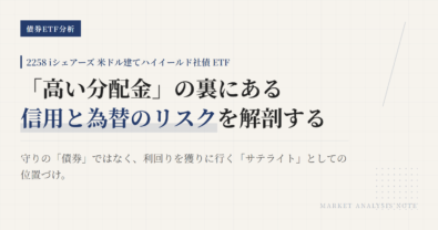 2258は、下がったら機械的に手放すための銘柄ではない。見るべきなのは値段そのものではなく、このETFを持つ前提がまだ生きているかどうかである。この記事では、2258をポートフォリオに置く意味を先に定義し、その前提が崩れたときだけ見直すための条件を整理する。2258は米ドル建てハイイールド債に連動し、年4回分配、NISA成長投資枠対象の東証ETFである。判断軸は「下落したから変える」ではない。米ド...