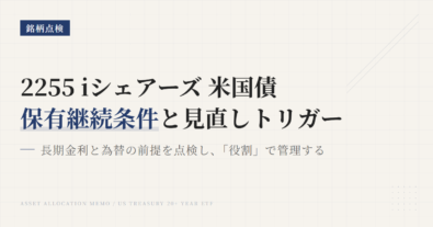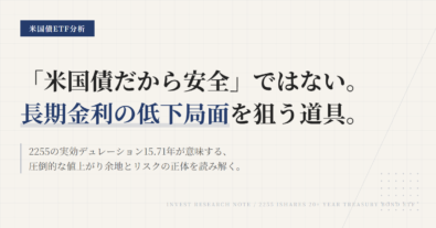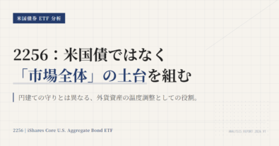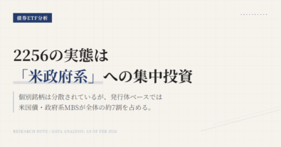 2256の中身を見るときは、「2256そのものの保有銘柄数」と「実質的に何に連動しているか」を分けて読む必要がある。見た目だけで“1銘柄しか持っていないETF”と判断すると外す。この記事では、2026年2月時点の断面データを使って、どこを見れば実態がつかめるかを整理する。実質的には米ドル建て投資適格債券市場全体を取りにいく商品、国債と政府系MBSの比率がかなり高い。個別債券の集中は低いが、発行体ベ...