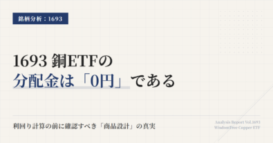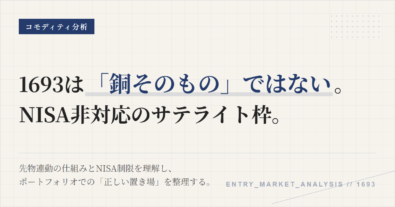 保有を続けてよい前提がまだ揃っているかを点検するための記事。銅価格の上下だけを見ると判断を誤る。商品性、役割、生活条件の3つに分けて見れば、見直すべき場面と、慌てて動かなくてよい場面が切り分けやすくなる。1693は「下がったから変える」のではなく、「銅先物に連動させる意味が薄れた」「ポートフォリオ内の役割が消えた」ときに見直す銘柄だ。判断軸は価格ではなく前提である。この銘柄をポートフォリオに置く理...