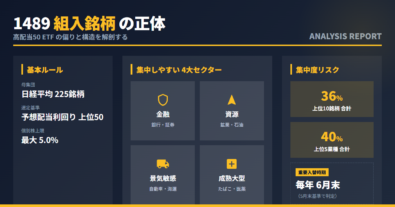 高配当ETFと聞くと、「銘柄数も多いし、なんとなく分散されてそう」そんなイメージを持ちやすい。1489も、ぱっと見はその代表格だ。ただ、実際に中身をのぞいてみると、指数ルール由来の偏りは意外と正直に現れてくる。この記事では、1489の組入銘柄について、どんな顔ぶれになりやすいのか。どこに偏りやすいのか。そして、どう入れ替わっていくのか。このあたりを順に整理していく。高配当50の性格は、指数の作りを...