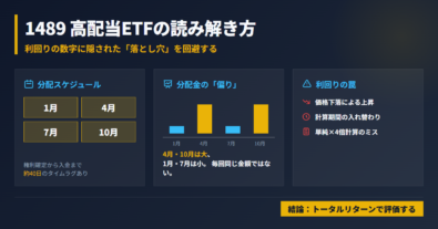 1489は人気だけど、「なぜその値動きになるか」を知らずに買うのは雑すぎる。この記事は利回り自慢じゃなく、設計図(指数ルール+ETFの構造)を読む回。母集団・銘柄選定・入替・ウェイト、そしてETFの価格の仕組みを押さえると、分配金や偏りも納得できるようになる。『利回り◯%』の見方を間違えたくないなら(利回りの落とし穴)1489の基本情報まずは、1489の基本スペックから。ここを押さえないと、後の話...