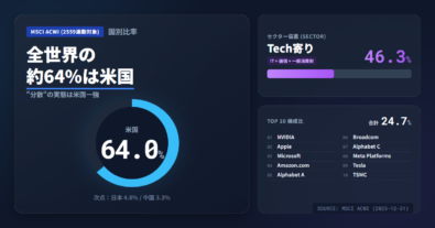 結論:2559の中身はMSCI ACWIの構成比でほぼ決まる。上位10銘柄で約24.7%、国別では米国が約64%と偏りも一発で見える。この記事では、上位10・国別/セクター比率の読み方、入替ルールの要点、そしてPCF/開示で2559の実保有を確認する方法まで整理する。上位10銘柄+国別比率表ここからは、MSCI ACWIのTop10(2025-12-31)。2559はこの指数に連動を目指すので、「...