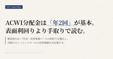ACWIの分配金は、毎月型ではなく「年2回が基本」の設計である。しかもBlackRockは年末に調整用の追加分配日を別枠で確保している。だから、この銘柄は利回りの高さよりも、半年ごとの入金タイミング、TTM、そして税引後にいくら残るかで読むほうがズレにくい。ACWIは半期分配が基本で、1回ごとの金額は平準化されない。見る順番は「権利落ち日→TTM→税引後手取り」であり、表示利回りを先に信じると判断...