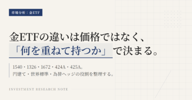 1541と1674は、どちらも東証で円で売買できるプラチナ商品だが、中身は同じではない。1541は大阪取引所の先物価格をもとにした国内の「グラム・円」理論価格に連動する内国商品現物型ETFで、NISA成長投資枠の対象である。1674はLPPM規格の現物プラチナに裏づく外国籍ETFで、NISA成長投資枠は対象外である。差は小さく見えて、使い方ではかなり効く。どちらを選ぶかは、NISAで持ちたいか、国...