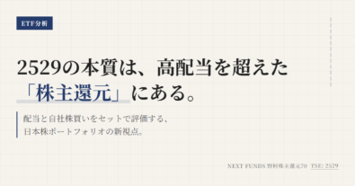 2529を読む軸は、単なる高配当ETFとして扱わないことにある。配当だけでなく自社株買いまで含めて、日本企業の株主還元をどう取りに行く商品かを整理できると、NISAで持つ理由と、他の高配当ETFに替えるべき場面が見えやすくなる。2529の芯は「高配当」ではなく「株主還元」である。配当金だけを重視するなら他候補もあるが、自社株買いまで含めた総還元で日本株を持ちたいなら、このETFは役割がはっきりして...