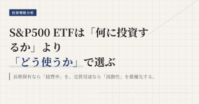米国のS&P500 ETFは、一見するとどれも同じに見えやすい。実際、連動対象が同じであれば値動きの大枠はかなり近い。だが、そこで「全部同じ」で片づけるのは雑である。長く持つための土台として使うのか、売買しやすい道具として使うのかで、見るべき場所は変わる。S&P500 ETFは「何に投資するか」だけでなく、「どう使うか」で選び方が変わる商品である。S&P500 ETFの基本は、米国大型株に広く乗る...
