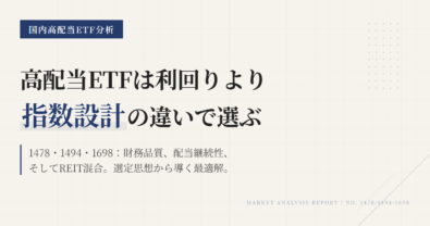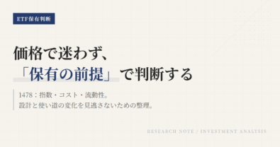 1478を見直すときに大事なのは、値動きで反応することではない。この記事は「いつ手放すか」を当てにいくものではなく、このETFをポートフォリオに置き続ける前提がまだ生きているかを整理するためのものだ。高配当ETFは下がる場面が必ずある。そのたびに迷わないために、先に継続条件を言語化しておく。「下落したから変える」ではなく、「指数・コスト・流動性・自分の役割定義という前提が崩れたら見直す」で判断する...