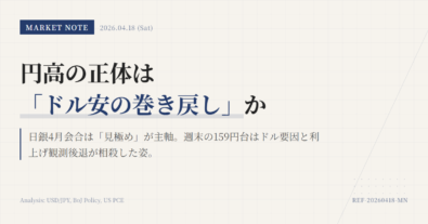 基準日:2026-04-25(JST)対象期間:2026-04-20 〜 2026-04-24(直近5営業日)結論今週は半導体・AI株の買いと中東情勢によるインフレ警戒が材料になって、株・米10年金利・ドル円が動いた週である。初心者が見る論点は2つだけでよい。論点①:米10年金利。米10年金利=お金を借りるコストの代表論点②:ドル円と原油。ドル円=1ドルを何円で交換できるかを示す数字今週のスコアボ...