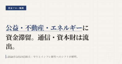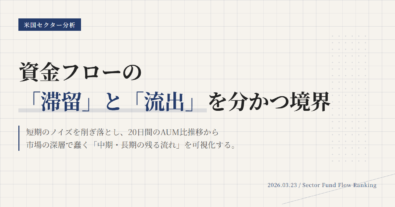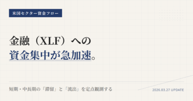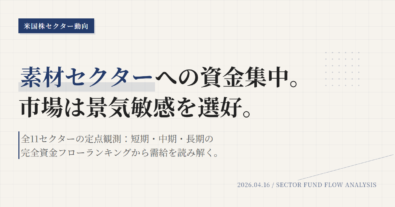 米国株全体は指数の上下が注目されやすい局面ですが、足元では「どのセクターへ資金が向かっているか」を見る方が市場の本音を掴みやすい場面です。価格は短期的に振れますが、資金フローには投資家の選好や継続性が出やすいからです。今回の集計では、素材セクターへの資金集中が目立つ一方、生活必需品には中長期で重い流出が続いています。金融・資本財も底堅く、ディフェンシブ一辺倒ではない構図です。全ランキング▼短期(3...