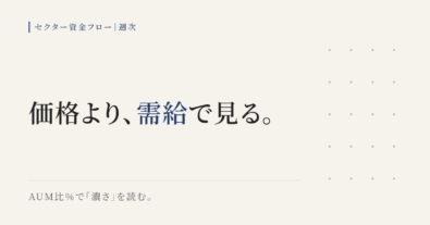 足元の資金の向きは、エネルギー・素材・資本財といった景気敏感へ寄り、テック中心の成長セクターは戻りが鈍い構図。価格は反発して見えても、投資家が実際に資金を増やしたか(需給)はフローでしか見えない。金額だけでなく、規模(AUM)で割ったAUM比%を併用すると「どれだけ濃く買われた/売られたか」が掴める。短期はニュースでぶれやすく、短期と中期で符号がズレることもあるため、3日・10日・20日の並びで確...