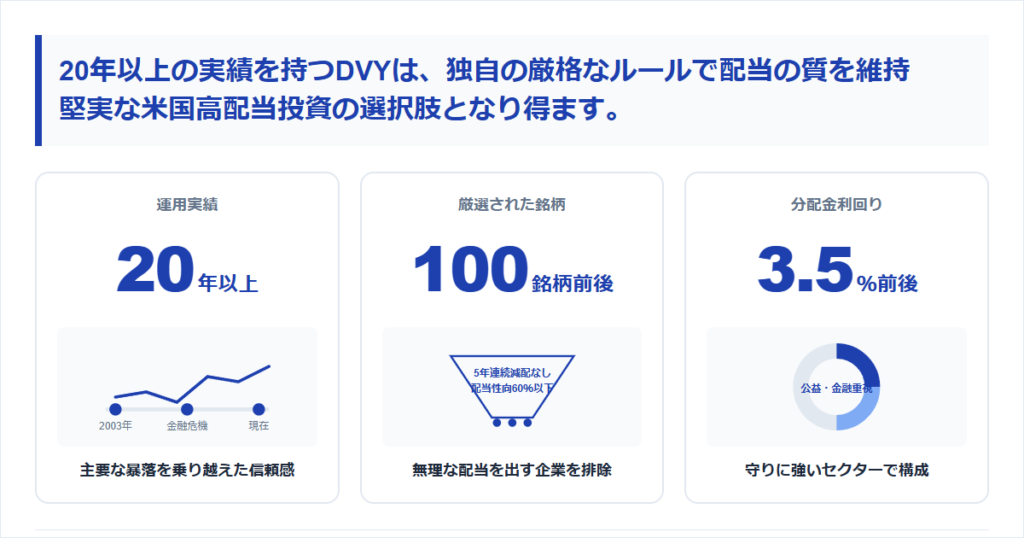 DVYは、米国の高配当株を約100銘柄に絞って分散し、インカムを狙う古参ETF。