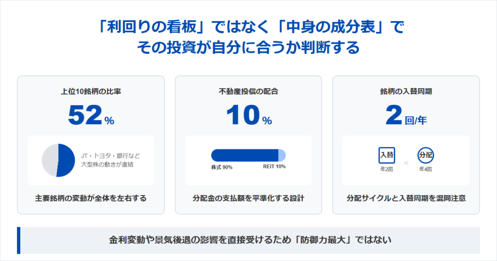 1698(上場インデックスファンド日本高配当/東証配当フォーカス100)は分配利回りが目立つタイプだが、投資判断で見るべきは「利回りの看板」より「中身の成分表」。