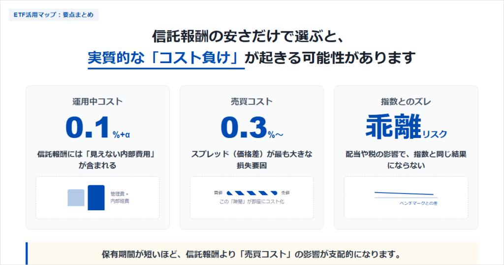 ETFのコストは、表に出る「信託報酬」以外にも、売買のたびに発生するコストや、指数とのズレ(トラッキング差)などが積み重なる。短期〜中期ほど、この差が効いてくる。