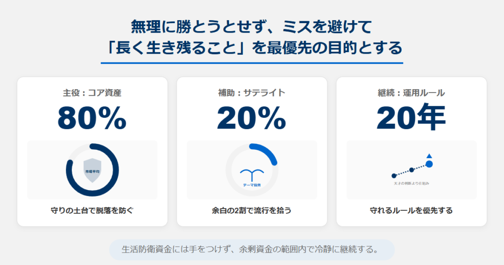 サテライトは少しだけが効く。だからこそ、比率・上限・撤退条件・見直し頻度を先に決めておけば、余計な判断が減って崩れにくい。