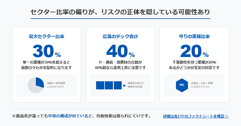 • 最大セクターが30%前後なら、そのセクターの調子がETFの調子になりやすい