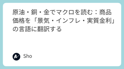 「商品価格はインフレの温度計。上がればインフレ、下がればデフレ。だから株も債券も同じ方向に考えればいい」。 ニュースも解説も、原油や金が上がったという数字だけで語るから無理もない。 価格という一つの数字に情報が凝縮されているせいで、中身まで同じに見えてしまう。でも、この理解は相場が荒れた瞬間に通用しなくなる。 原油が跳ねても銅が沈み、金が動かない日がある。 逆に金が上がるのに原油が弱い日もある。 ...