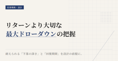 失敗しない運用ルール 最大ドローダウンと回復期間の考え方 ドローダウン(ピークからの下落率)と、そこから元の水準に戻るまでの時間。この2つを事前に把握しておくだけで、「下落時に売るか売らないか」の判断に使える自分なりの基準が持てるようになる。ポートフォリオの継続性を決めるのはリターンより「最大の下落と回復期間に自分が耐えられるか」だ。設計段階でこれを組み込んでおかないと、相場が荒れるたびに一から判断し直すことになる。ドローダウンとは何か、なぜ「平均リター... 2026.02.26 失敗しない運用ルール投資戦略