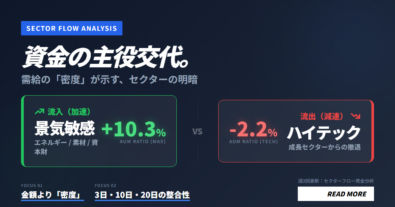 足元の資金の向きは、エネルギー・素材・資本財といった景気敏感へ寄り、テック中心の成長セクターは戻りが鈍い構図。価格は反発して見えても、投資家が実際に資金を増やしたか(需給)はフローでしか見えない。金額だけでなく、規模(AUM)で割ったAUM比%を併用すると「どれだけ濃く買われた/売られたか」が掴める。短期はニュースでぶれやすく、短期と中期で符号がズレることもあるため、3日・10日・20日の並びで確...