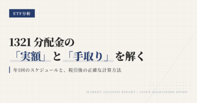 1321は、日経225に連動する国内ETFの中でも知名度が高い一本だ。だが、分配金を見るときに「年1回」「利回り○%」だけで判断すると、受け取り額も買うタイミングも簡単に読み違える。この記事では、1321の分配スケジュール、実績、税引後の手取り、利回りの見方を、実際に計算できる形まで落として整理する。1321の分配金は毎年7月8日を基準に年1回で、金額表示は10口あたり。まずは「いつまでに買えば権...