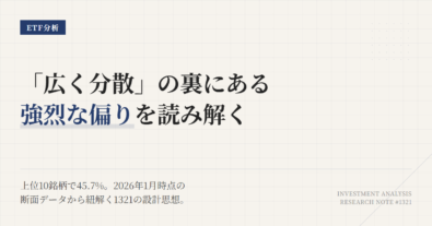 1321は、日経225そのものではなく、配当を加味した「日経平均トータルリターン・インデックス」に連動するETFである。だが、中身は225銘柄に薄く均等分散しているわけではない。値がさ株の影響が大きく、電気機器や情報・通信、小売の存在感が強い。この記事では、2026年1月時点の断面データから、その偏りと読み方を整理する。1321の中身を見るときは、「225銘柄入っているか」より「上位銘柄にどれだけ...