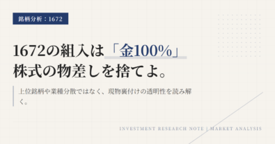 1672の中身をひと言で言えば、企業の株ではなく、LBMAのGood Delivery基準を満たす金地金である。だから確認ポイントは「何社に分散しているか」ではなく、「本当に現物裏付けか」「どの価格を参照するか」「その裏付けがどこまで開示されているか」に変わる。1672の組入は実質的に金100%。上位銘柄やセクターを見る記事でも、株式ETFの物差しをそのまま使ってはいけない。見るべきは、ファクトシ...