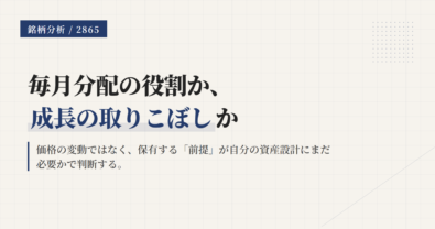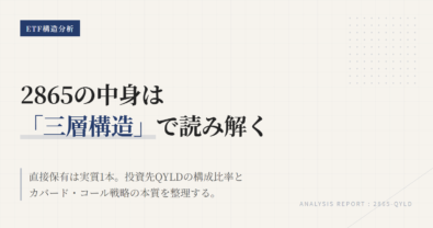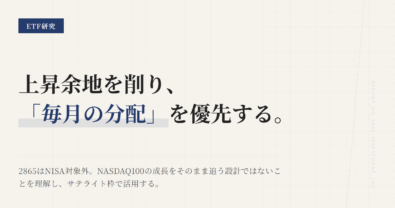 この記事は、2865をいつ手放すかを当てにいくものではない。そうではなく、保有を続けてよい前提は何か、どの前提が崩れたら見直すのかを整理する記事である。2865は毎月分配が目立つが、中身はNASDAQ100にカバード・コールを重ねた、かなり性格のはっきりした道具だ。その役割を言語化できないまま持つと、上昇局面でも下落局面でも判断がぶれる。2865は「下がったから変える」のではなく、「毎月分配を優先...