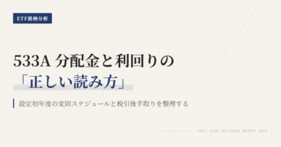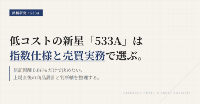 533Aを見直すときに大事なのは、値下がりしたかどうかではない。この記事は下落局面での行動を当てるためのものではなく、保有を続ける前提がまだ生きているかを確認するための整理表である。なお533Aは2026年3月12日時点では上場前であり、板や出来高は上場後確認が前提になる。判断軸は「下がったから変える」ではなく「前提が壊れたから変える」である。533Aを持ち続けてよいのは、S&P500を円ベース・...