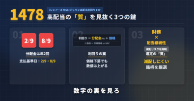高配当ETFって聞くと、「毎年ガッツリ配当が入ってくるやつでしょ?」って、つい思ってしまう。その気持ちはわかる。でも相場は、そんなに都合よくできてない。だからこの記事では、1478(iシェアーズ MSCIジャパン高配当利回りETF)の分配金と利回りについて、読み解いていく。ここでわかるのは大きく3つ。1478の分配金スケジュール――支払基準日や権利付き最終日、権利落ち日、支払予定日がどうなっている...