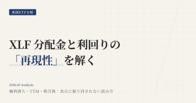XLFを「いつ手放すか」を断定する記事ではない。金融セクターをポートフォリオに置く理由を言語化し、指数・コスト・流動性・役割の前提が揃っている限り持ち続けるための条件と、前提が崩れたときの見直しトリガーを整理する。下落は理由にならない。点検するのは「XLFが金融セクターを運ぶ手段として機能しているか」だけだ。指数・コスト・流動性・役割のどれかが壊れたら、壊れた箇所だけを置換する。この銘柄をポートフ...
