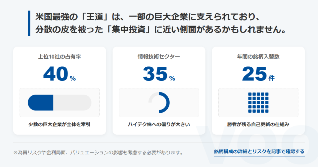 要するに、VOOのパフォーマンスは「少数の巨大企業」に寄りやすい、ってことだな。