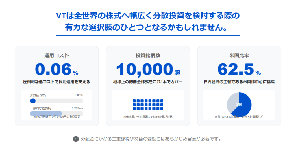 こうした点を踏まえると、VTは長期の国際分散投資の中心に置きやすい商品だと言える。